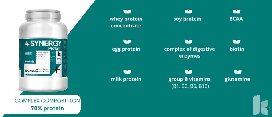 Milk protein provides long-term muscle support, while whey protein quickly delivers amino acids for tissue repair. Egg protein adds its essential amino acids to overall muscle growth and tissue repair. Soy protein (non-GMO), as a plant source, also contributes to building bigger muscles and recovery, and its isoflavones may be beneficial for heart health. 4 SYNERGY Protein is enriched with essential BCAA amino acids, L-glutamine and a complex of digestive enzymes, the effectiveness of which is supported by vitamins.