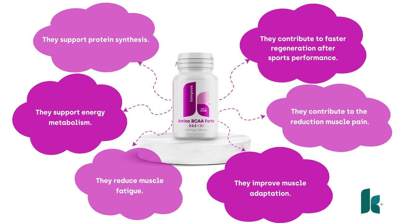 BCAA amino acids make up to 35% of the content of muscle mass and are crucial for the generation of energy in sports-stressed muscles. They are considered the basic building blocks of proteins and participate in the formation of new muscle tissue. Their presence in the body accelerates the production of proteins and prevents their breakdown in the muscles during strenuous exercise and physical exertion. Amino BCAA Forte are created from special branched essential BCAA amino acids - leucine, isoleucine and valine in a unique ratio of 2:1:1. The 2:1:1 ratio means that leucine is present in the largest amount (most effective for supporting muscle synthesis and recovery). The body cannot produce these important compounds on its own, so it is essential that you obtain them from food or through nutritional supplements.