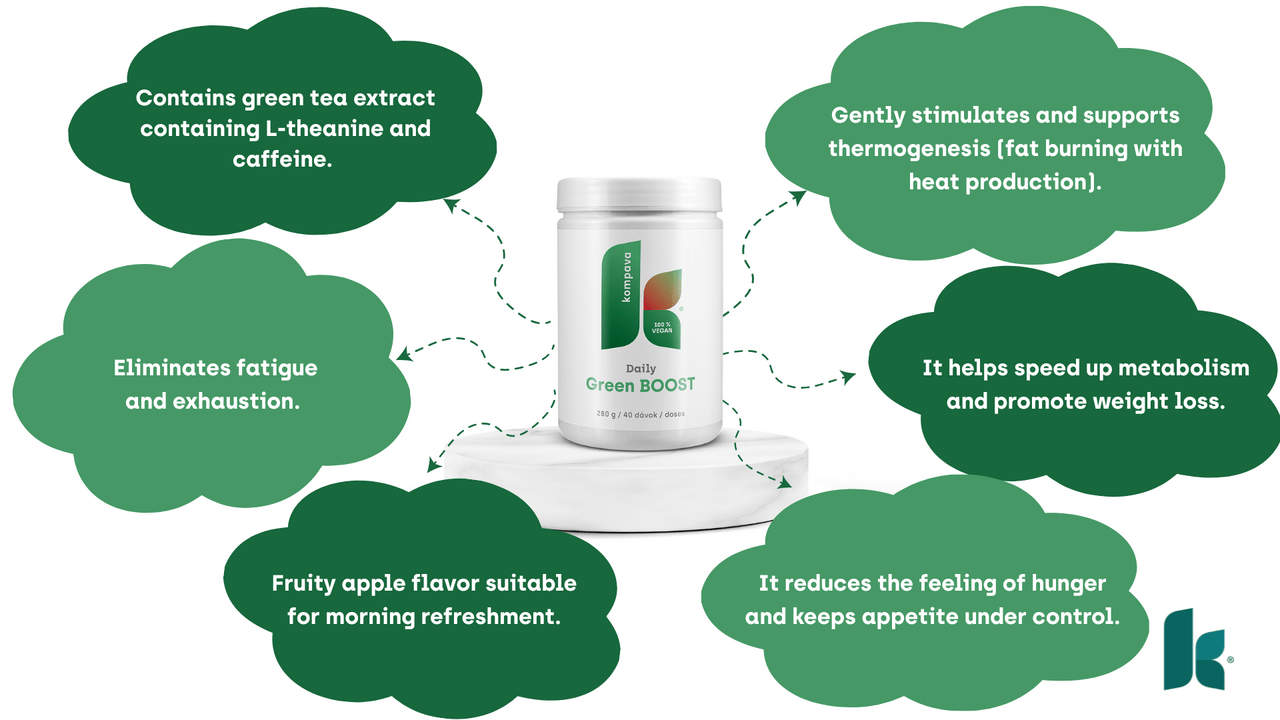 Daily Green BOOST (Green Apple) contains green tea extract with L-theanine and caffeine. Feel bright, healthy, calm-flowing energy for longer. This drink gently stimulates and promotes thermogenesis - an important mechanism in fat reduction, making it an effective weight loss drink for those who want to start the day actively. Daily Green BOOST has a light fruity apple taste and is suitable for a morning refreshment.