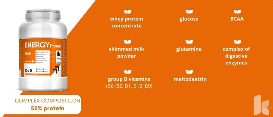 It is enriched with anabolic substances such as L-glutamine and BCAA, which are necessary for the growth of muscle mass, muscle protection and regeneration after a demanding training, in addition to providing the athlete with the necessary energy. The enzyme complex contained in ENERGY Protein improves its absorption, the utilization of all the nutrients contained in it and prevents bloating.