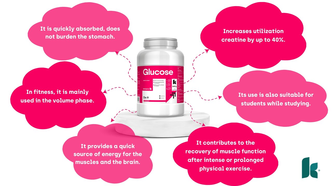Glucose contributes to the restoration of normal muscle function after high-intensity or prolonged physical exertion resulting in muscle fatigue and depletion of skeletal muscle glycogen stores. We recommend adding glucose to creatine as well, thanks to which the utilization of creatine increases by up to 40%, while a reaction occurs when creatine automatically reaches the target cell faster.