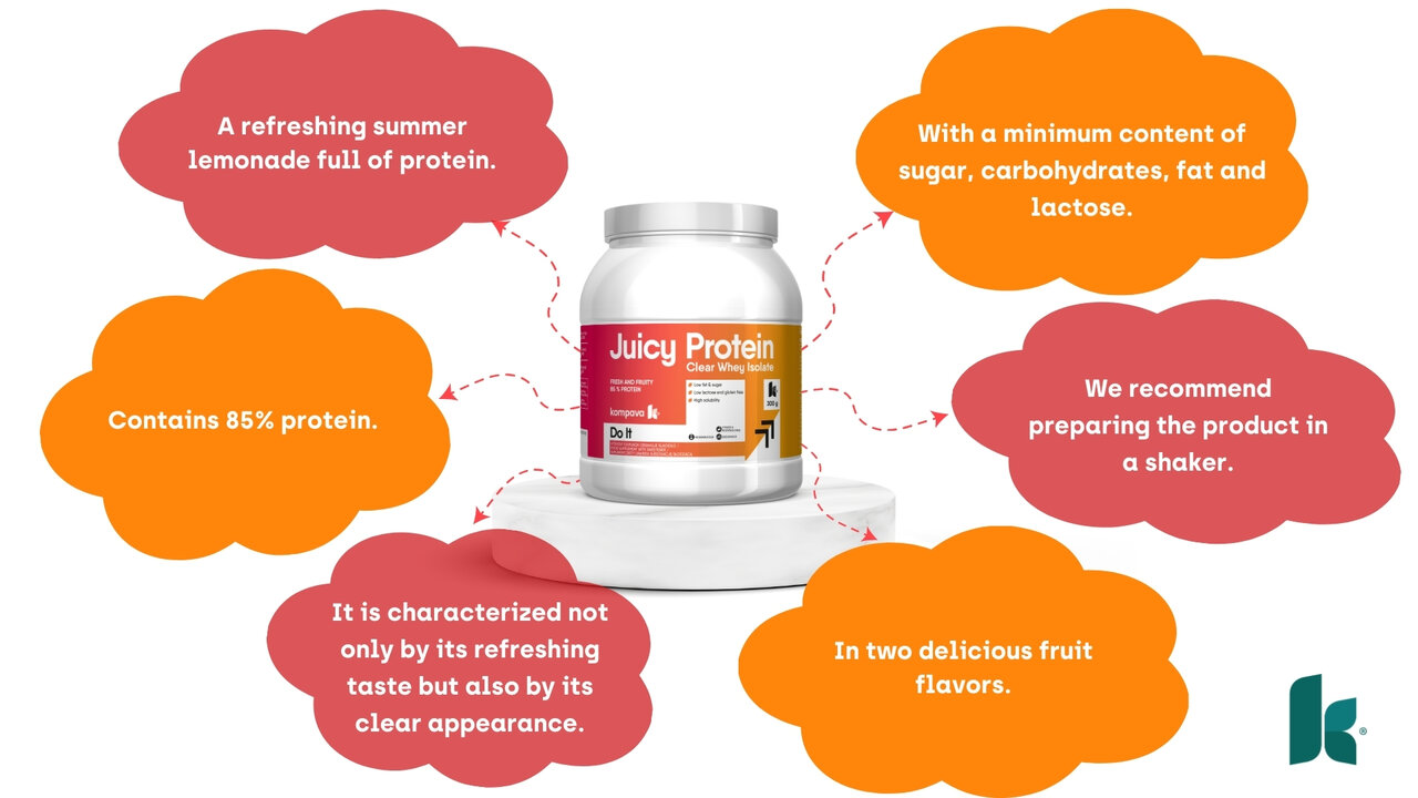 Juicy Protein is the perfect way to get protein without feeling like you're drinking a classic creamy milkshake. Juicy Protein is a product with a minimum content of sugar, carbohydrates, fat and lactose. Up to 85% of its composition consists of first-class protein. This superior formulation provides the same nutritional value as traditional milk protein shakes.