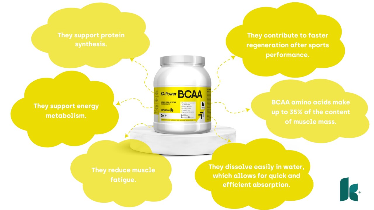 BCAA amino acids make up to 35% of the content of muscle mass and are crucial for the generation of energy in sports-stressed muscles. They are considered the basic building blocks of proteins and participate in the formation of new muscle tissue. Their presence in the body accelerates the production of proteins and prevents their breakdown in the muscles during strenuous exercise and physical exertion. K4 Power BCAAs are created from special branched essential BCAA amino acids - leucine, isoleucine and valine in a unique ratio of 4:1:1. The 4:1:1 ratio means that leucine is present in the largest amount (most effective for supporting muscle synthesis and recovery). The body cannot produce these important compounds on its own, so it is essential that you obtain them from food or through nutritional supplements. BCAA 4:1:1 dissolve easily in water, which allows for quick and efficient absorption during or after training.