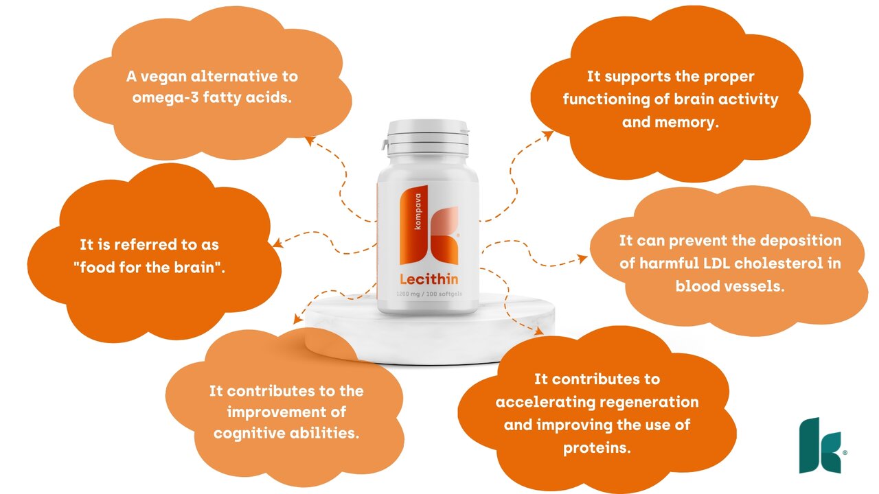 Lecithin is composed mainly of choline and inositol. Choline is an important component of acetylcholine, an essential neurotransmitter (transmitter of nerve impulses), which is essential for the proper function of brain activity and memory. Lecithin also prevents the deposition of harmful LDL cholesterol in the blood vessels, and thus acts as a preventive against cardiovascular diseases, helps break down alcohol in the liver and thus reduces the risk of liver damage, strengthens memory and concentration.