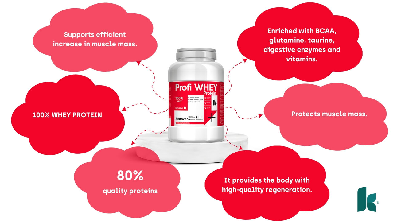 Profi WHEY Protein was developed to achieve your desired fitness goals. It contains 100% whey protein, so thanks to its high protein content and minimal amount of carbohydrates and fats, it is ideally suited to a diet. It represents an ideal and tasty form of high-quality protein supplementation after a demanding training session. Thanks to the content of the amino acid l-glutamine and BCAA, it significantly contributes to faster muscle regeneration. The enzyme complex contained in Profi Whey protein improves its absorption, the utilization of all nutrients contained in it and also prevents bloating. It is also suitable for diabetics.