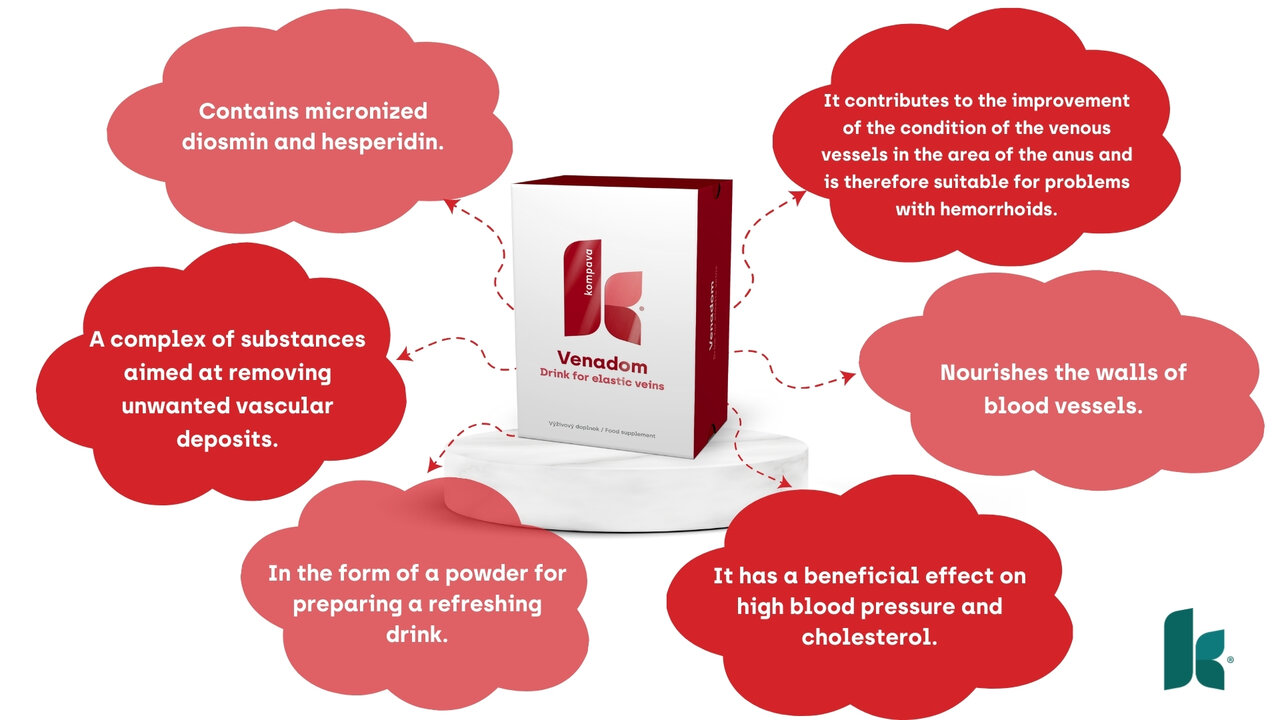 In addition, by using the nutritional supplement Venadom, you will naturally replenish your body with fluids that are necessary for nourished and healthy blood vessels. The product contains a high proportion of proteins, a minimum of fat and no added sugar. It is suitable for diabetics, celiacs and people with lactose intolerance.