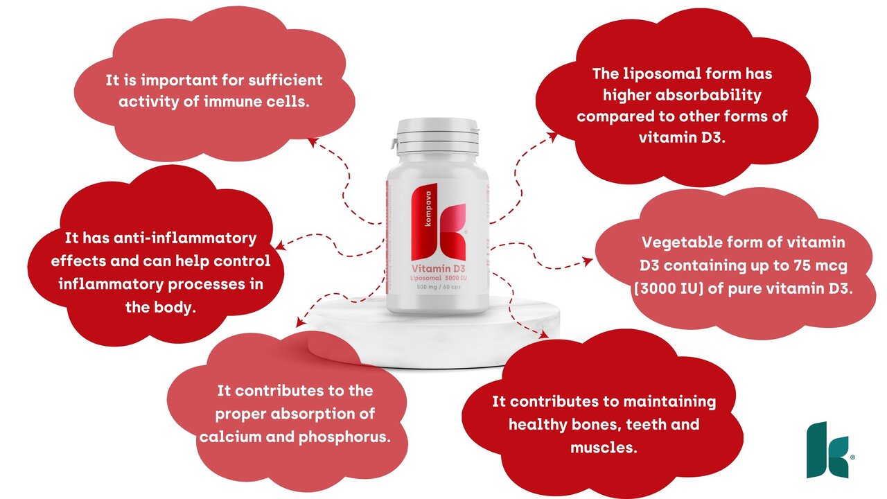 Liposomal Vitamin D3 (3000 IU) is important for sufficient activity of immune cells, thus contributing to the proper functioning of the immune system. It is also important for the proper absorption and utilization of calcium and phosphorus, which contributes to maintaining healthy bones, teeth and muscles. Vitamin D is soluble in fats, which means that its absorption in the digestive tract is limited. For this reason is better to take vitamin D, which has better utilization in the body. This includes the liposomal form of vitamin D3, which is almost completely absorbed in the intestine and gets from there to a right place in the body.
