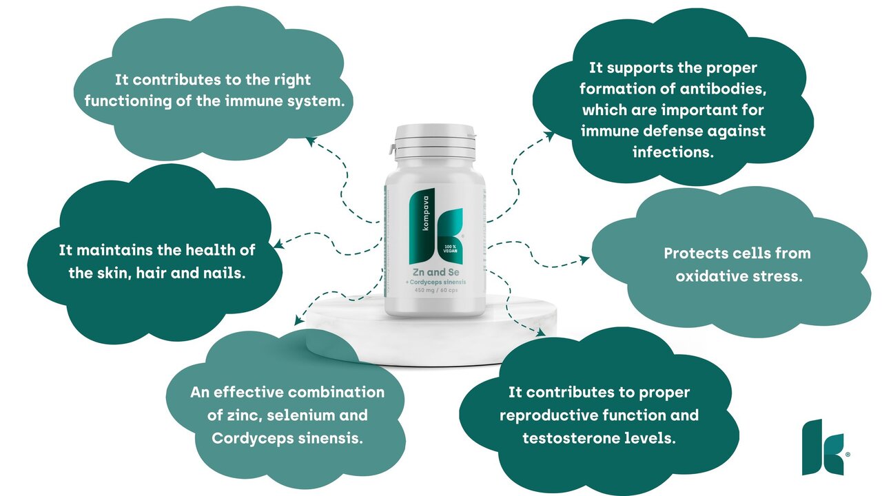 Zinc is a key element that helps maintain a healthy immune system, supports tissue growth and regeneration, and contributes to the normal functioning of cognitive functions. Its deficiency can lead to various adverse manifestations, therefore it is important to ensure sufficient intake of zinc through diet or nutritional supplements. Selenium is a mineral with significant antioxidant properties that contributes to the protection of cells against oxidative stress. It contributes to the proper function of the thyroid gland and can help maintain a healthy cardiovascular system. Selenium also supports immune function, contributing to overall health. Cordyceps sinensis contains bioactive substances such as polysaccharides that contribute to the support of the immune system.